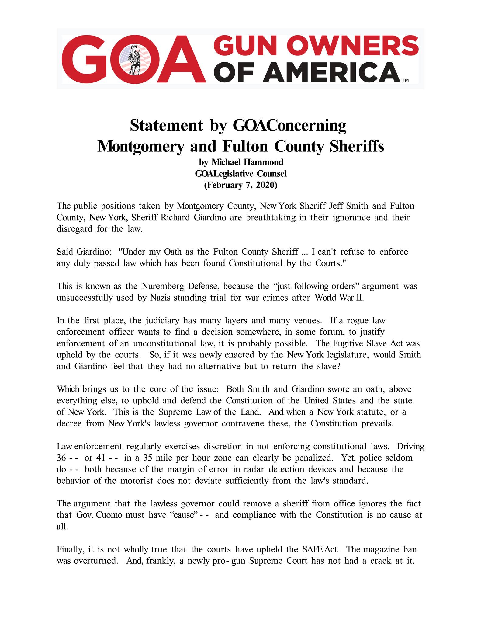 GOA has done next to nothing in New York, but they did send out this press statement in response to two local sheriffs expressing their opposition to making their counties “2nd Amendment Sanctuaries.”