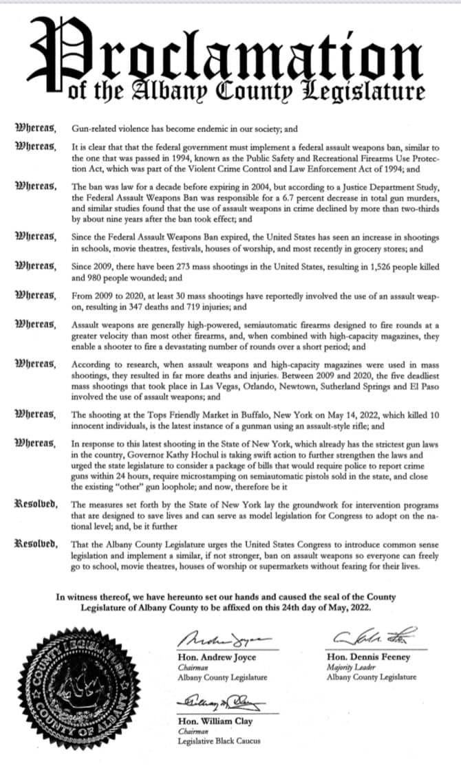 “Members of the Albany County Legislature continue to prioritize ending gun violence while also calling on the federal government to do the same. On Tuesday, the Legislature issued a proclamation calling for members of the federal government to reinstate an Assault Weapons Ban, similar to the one that was enacted in 1994 but never reinstated when it expired …”